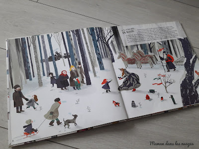 Ce grand livre documentaire nous emmène à travers le monde pour découvrir la diversité des traditions de Noël. Le livre s'ouvre sur un planisphère qui permet de situer les 15 enfants présentés ensuite. A chaque double page, le pays et l'illustrateur changent. Nous avons ainsi appris à dire "Joyeux Noël!" en Inuit ( "Juullimi Ukiortaassamilu Pilluarit !", mais on doit encore travailler notre prononciation...), que les Slovaques jeûnent pour le déjeuner du 24 décembre, que les Éthiopiens vont à la messe à 4 heures du matin... Nous avons découvert le Père Gel et Snegourotchka, la petite fée des neiges russe, Saint Nicolas et ses krampus en Autriche, et que Noël a lieu pendant les vacances d'été en Australie !