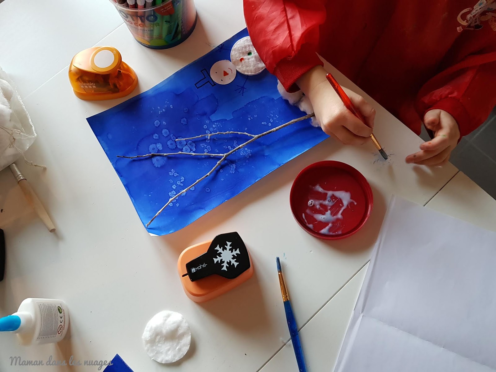 Une fois nos fonds secs, nous y avons collé du coton pour faire un sol enneigé. Petit Bonhomme m'a alors dit qu'il voulait faire un bonhomme de neige. Bonne idée ! Avec la perforeuse, nous avons découpé un rond dans une feuille blanche pour la tête du bonhomme et pour le corps, nous avons utilisé un disque de coton démaquillant. Nous avons ensuite complété nos bonshommes aux feutres en leur ajoutant yeux, nez en carotte, bras et chapeau. Petit Bonhomme a voulu ajouter des skis à son bonhomme, mais comme il n'était pas satisfait de son premier ski qu'il trouvait trop petit, je lui ai proposé de dessiner plutôt des raquettes. Et il a bien sûr pensé à ajouter des bâtons. Voilà un bonhomme de neige bien équipé !